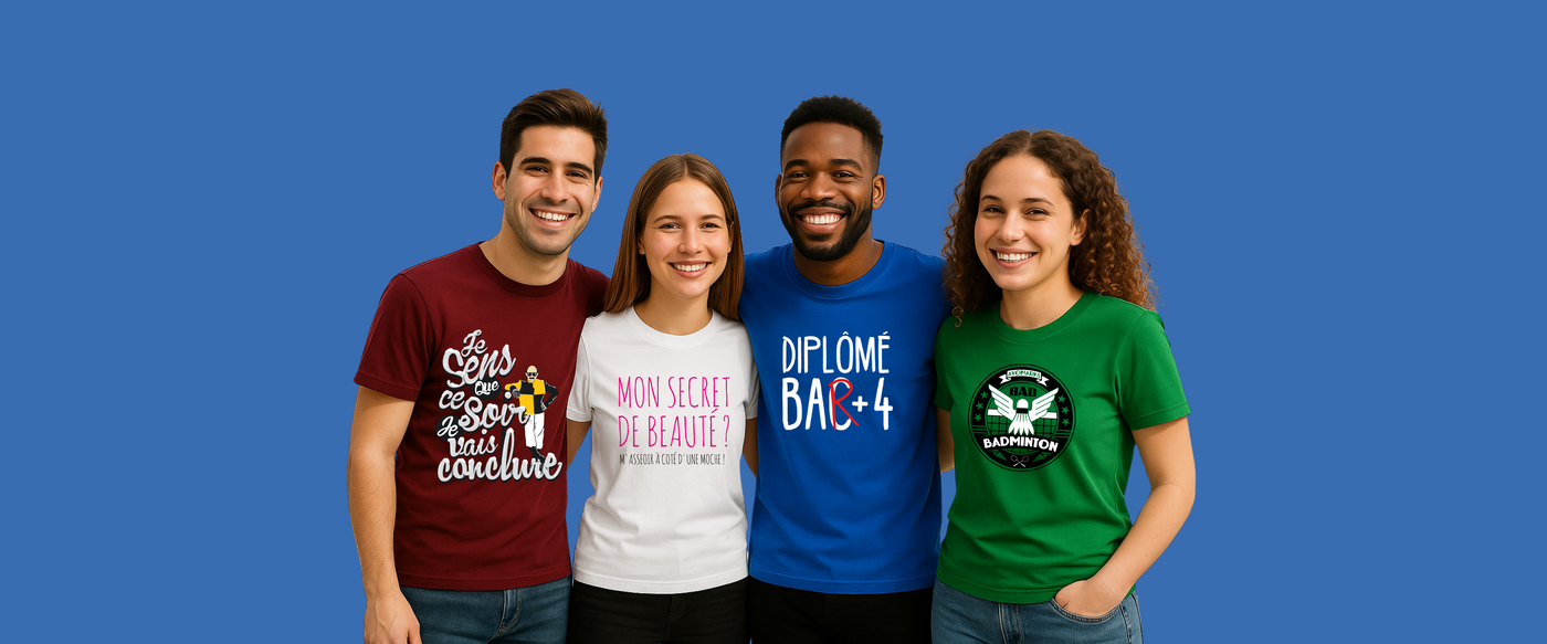 Attention, impression de t-shirts addictive ! Quand on goûte au plaisir de t-shirts originaux, on en redemande et on a vite envie d'en acheter plus qu'on ne peut en porter ! Ça tombe bien, sur Avomarks.fr, des t-shirts personnalisés, il y en a une quantité incroyable, et le quatrième est offert pour trois t-shirts originaux achetés !