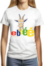 Il aura fallu une petite sonorité pour faire penser au graphiste, oui c'est assez bizarre un cerveau de graphiste, on est d'accord, qu'il pouvait faire une parodie du site ebay en le transformant en Ebééé. Et de fil en aiguille qui dit Ebééé, dit chèvre. Vous aurez noté le petit éclair d'intelligence qui brille dans l'œil de la chèvre ... je crois qu'on peut dire qu'il ajoute une petite pointe à l'humour de ce t shirt.