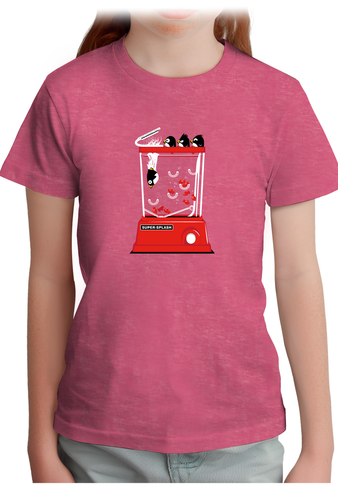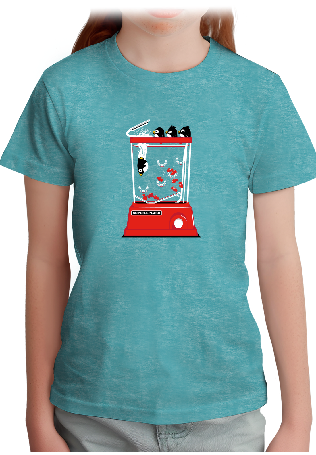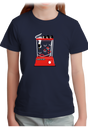 C'est sûr que si vous montrez ça à des ados en leur disant que c'était un des premiers jeux vidéos ... ils ne vous croiront pas. Bien sûr que ce n'est pas un jeu vidéo de gamers mais pourtant si on y regarde de plus près, on n'est pas si loin, qu'est-ce qu'on voit ? On a une console, un seul bouton, ça évite de faire des combinaisons compliquées et de les apprendre surtout, mais un bouton quand même qui sert à faire bouger le jeu. Des pingouins qui plongent pour attraper les poissons tout ça en appuyant sur le bouton. Alors ? Ça vous rappelle pas des jeux vidéos ce tee shirt ?