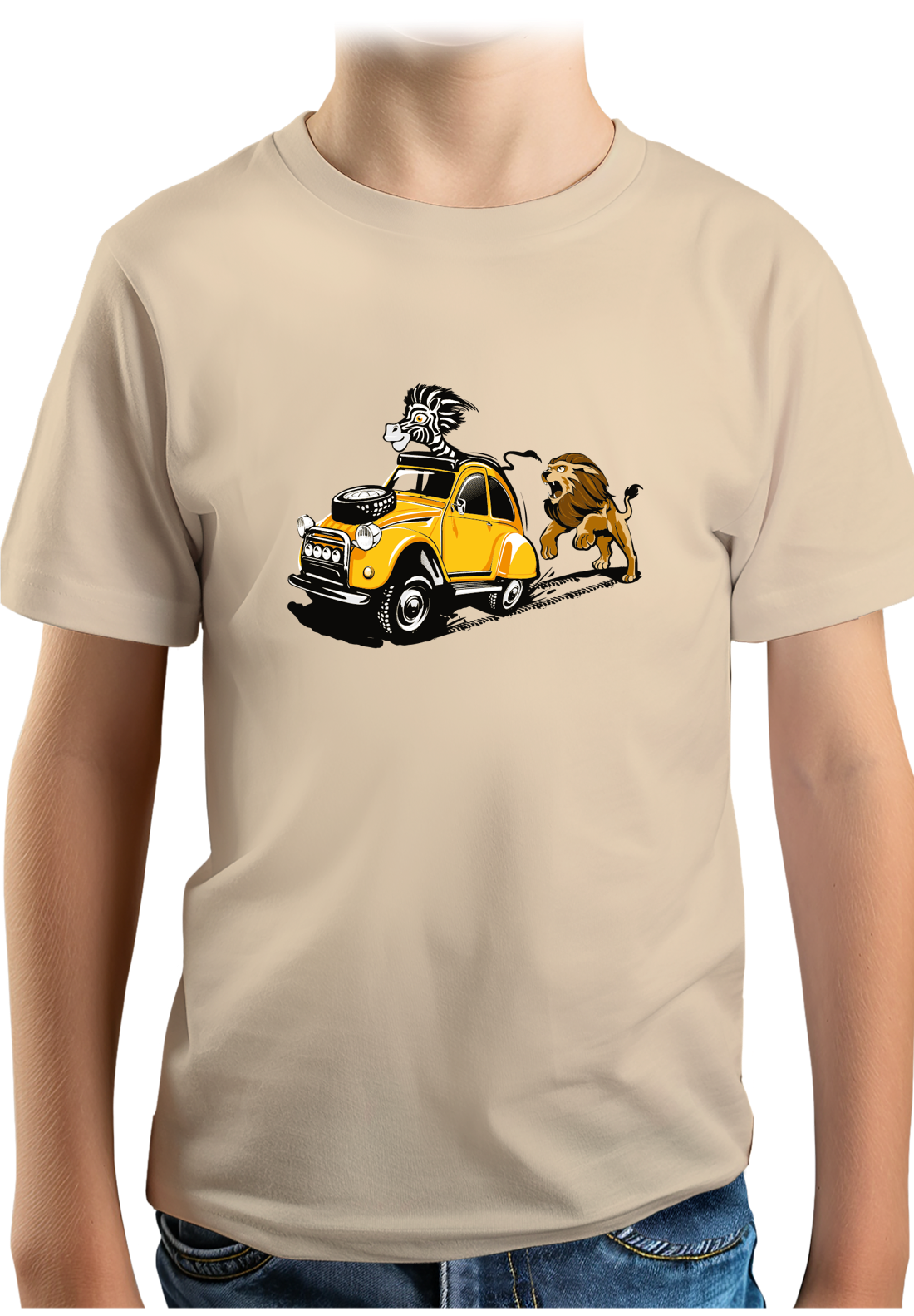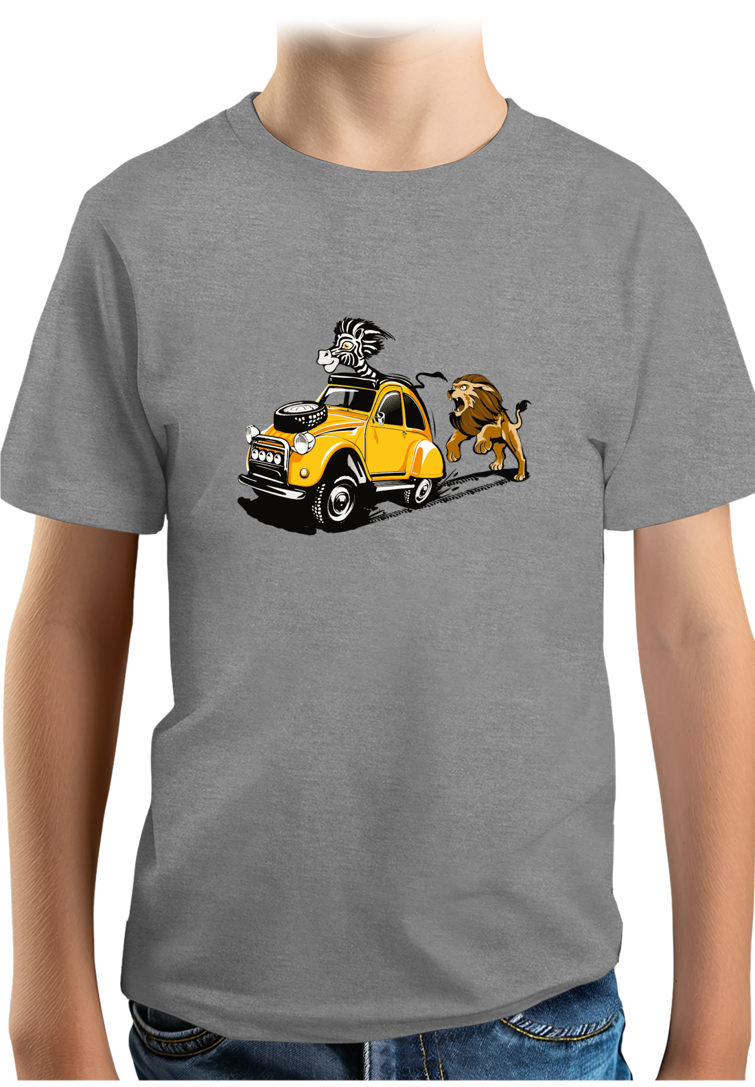 Ce tee-shirt aurait pu être une illustration faite à partir d'une fable de La Fontaine : le lion et le zèbre, avec pour fin, rien ne sert de courir il faut partir en deuche. Et oui, le zèbre est plutôt un animal malin qui a le sens de la survie et un certain sens de la formule pour sauver sa peau comme vous pouvez le voir sur ce tee-shirt également.