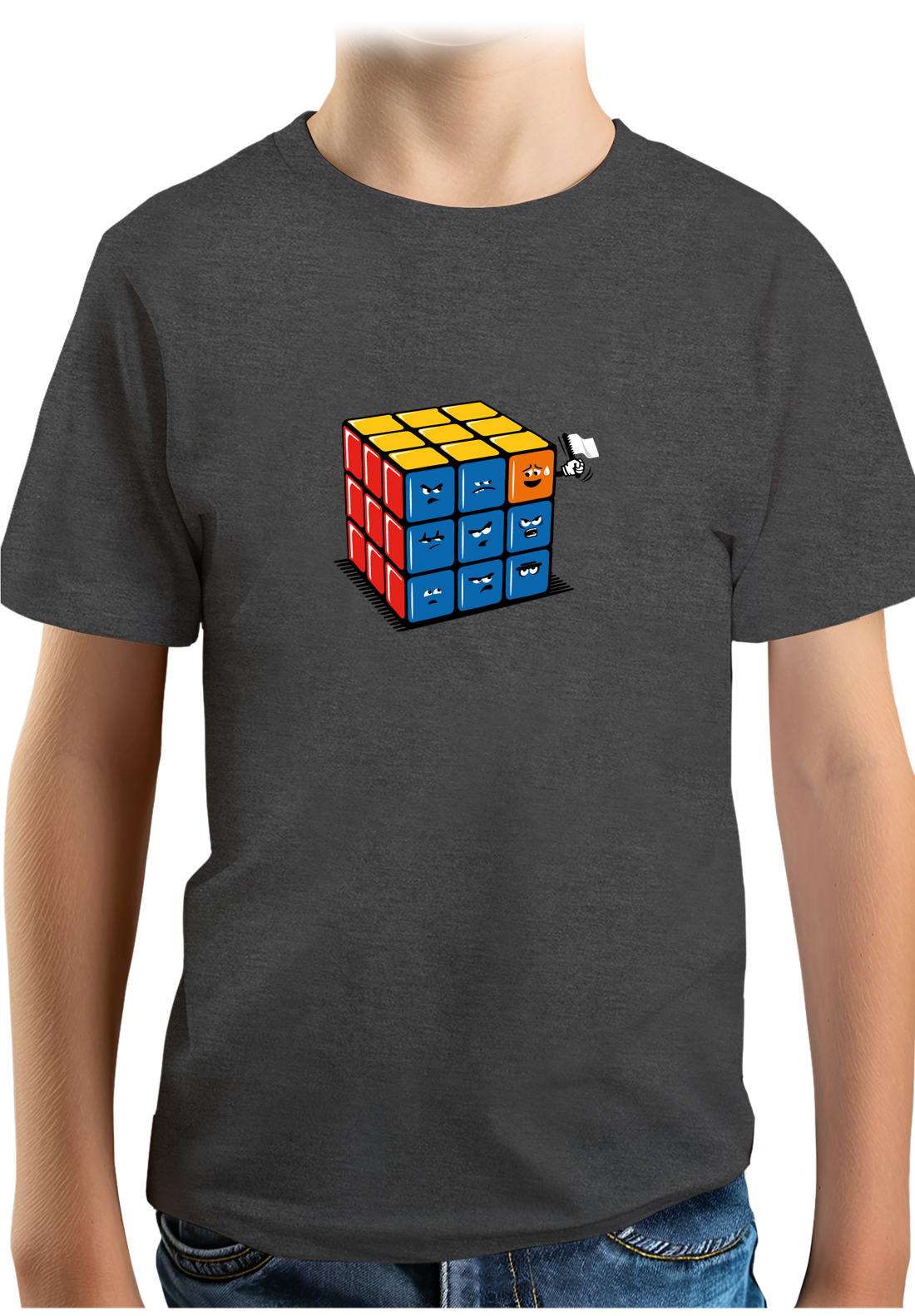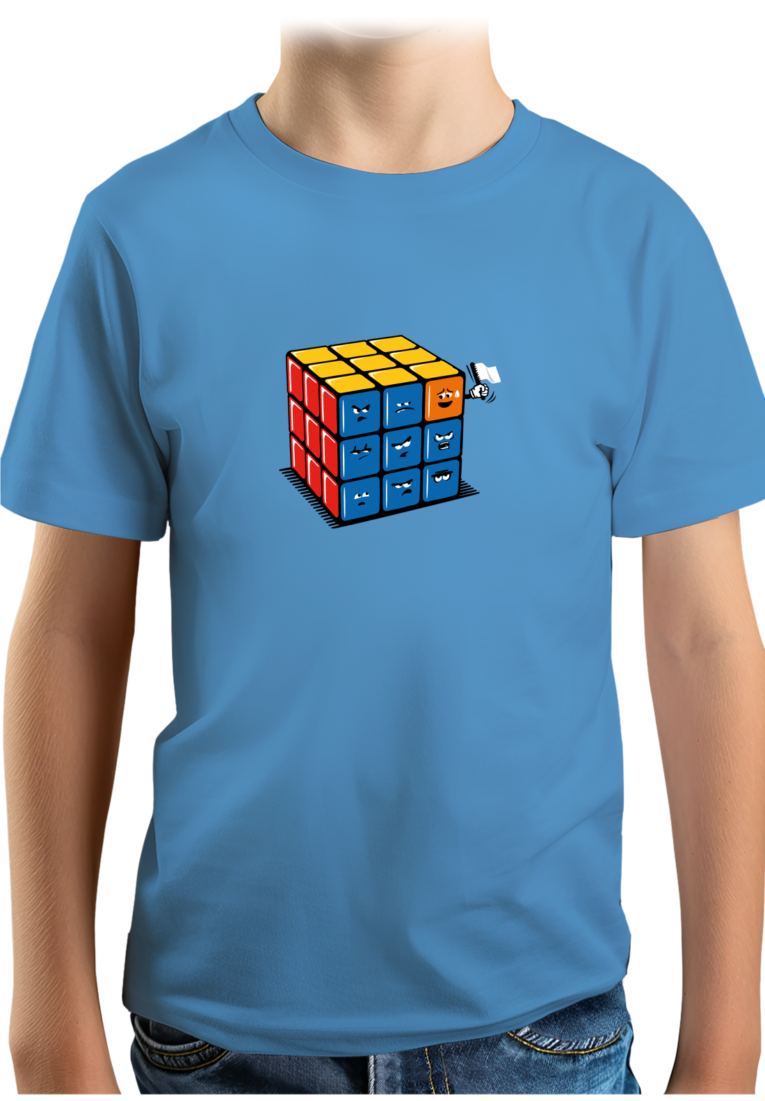Alors que certains battent des records de vitesse pour mettre toutes les faces de la bonne couleur. D'autres battent tous les records de lenteur car ils ont toujours le petit carré qui fait le défaut comme vous pouvez le constater sur ce t shirt personnalisé plein d'humour. Quand vous êtes celui qui joue avec le rubik's cube, ça vous énerve beaucoup mais quand vous faites partie des petits carrés de couleurs et que vous voyez toujours un carré qui n'est pas des vôtres s'introduire dans le groupe ça énerve encore et c'est ce que vous explique le graphiste Mega-lek sur ce t shirt.