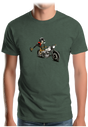 On le connaissait poor lonesome cowboy partant dans le soleil couchant, le voilà en motard des temps modernes dans cette parodie de mega-lek. Laissant tomber le jean's, la chemise jaune et le chapeau mais gardant son foulard rouge et ses bottes, le voilà casqué et habillé tout en cuir pour chevaucher sa moto jolly biker". Celle-ci lui coûte plus cher en essence qu'en avoine mais elle sillonne plus rapidement les routes. Un t-shirt pour motard mais également pour fan de lucky luke. "