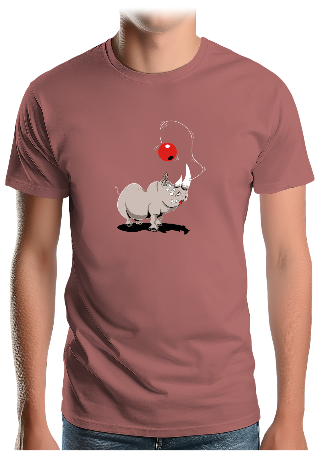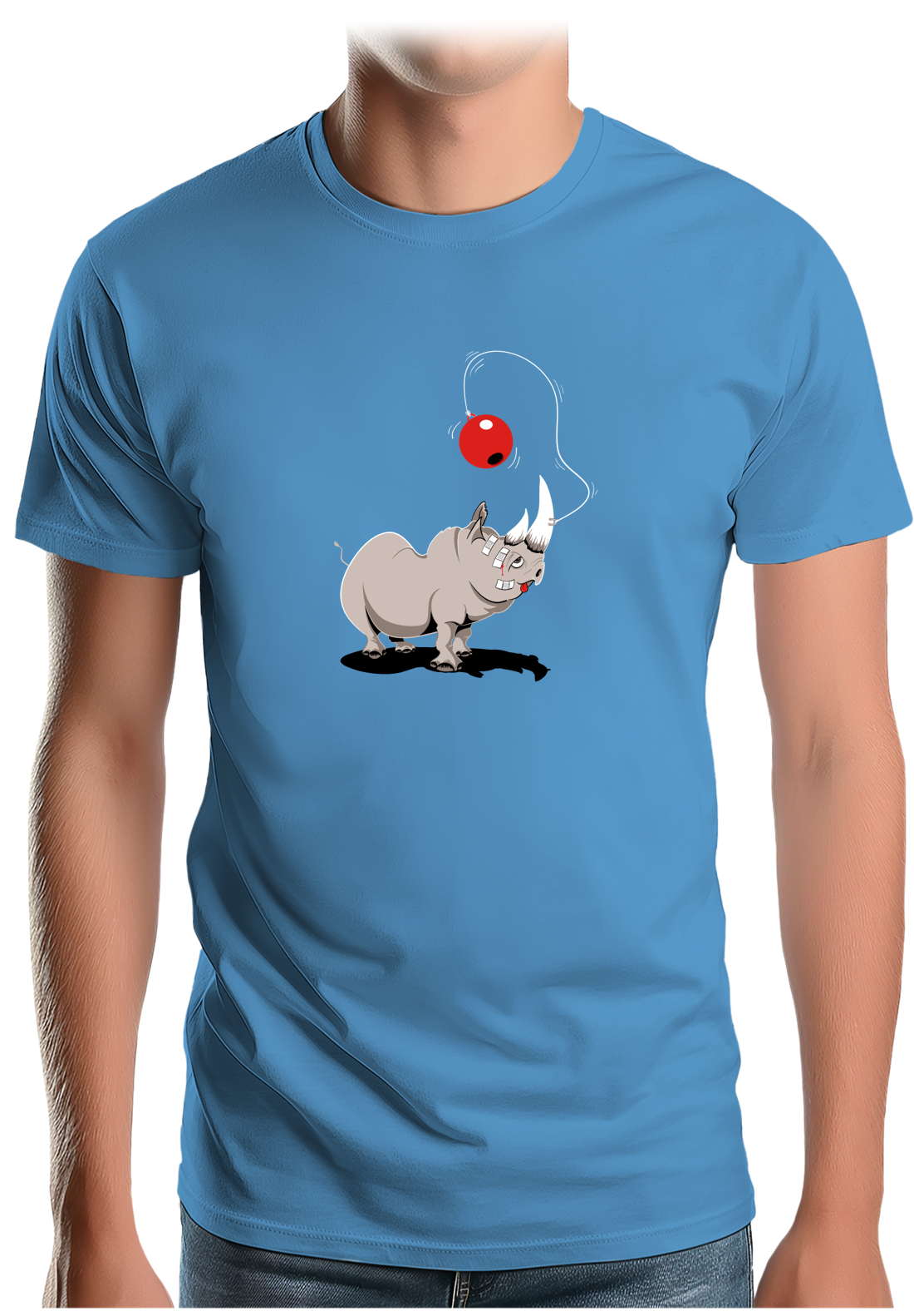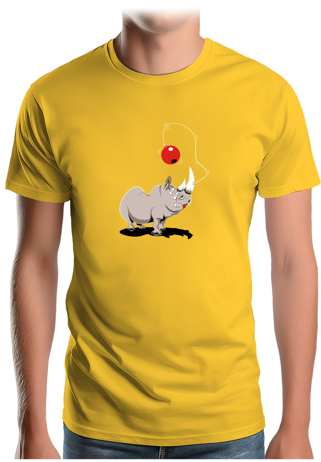Dans la savane, un phénomène de mode étrange est arrivé. Tous les rhinocéros jouent au bilboquet, vous nous croyez pas ? Qu'est-ce que vous voyez sur ce drôle de t-shirt ? Comme nous ! Vous voyez un rhinocéros qui joue au bilboquet. Mais vous constaterez également qu'il vient juste de recevoir son jeu par Amazon puisqu'à voir le nombre de pansements qu'il porte, il rate encore beaucoup son coup. Le jeu est fourni avec une boîte de pansement et ce t-shirt.