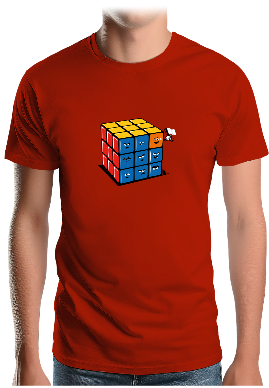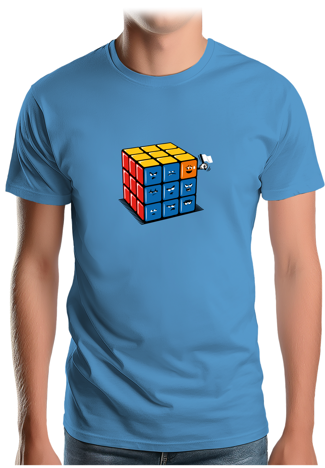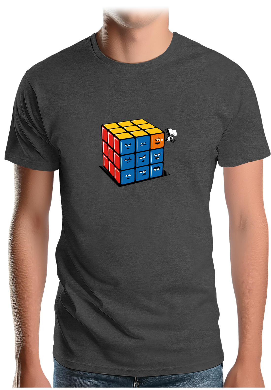 Alors que certains battent des records de vitesse pour mettre toutes les faces de la bonne couleur. D'autres battent tous les records de lenteur car ils ont toujours le petit carré qui fait le défaut comme vous pouvez le constater sur ce t shirt personnalisé plein d'humour. Quand vous êtes celui qui joue avec le rubik's cube, ça vous énerve beaucoup mais quand vous faites partie des petits carrés de couleurs et que vous voyez toujours un carré qui n'est pas des vôtres s'introduire dans le groupe ça énerve encore et c'est ce que vous explique le graphiste Mega-lek sur ce t shirt.