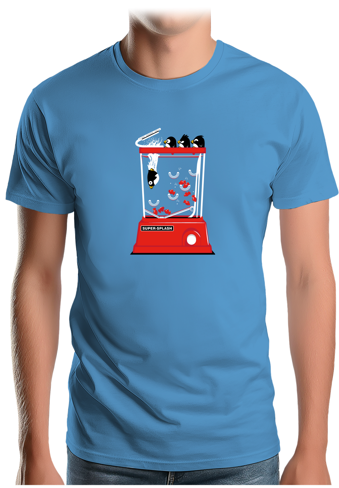 C'est sûr que si vous montrez ça à des ados en leur disant que c'était un des premiers jeux vidéos ... ils ne vous croiront pas. Bien sûr que ce n'est pas un jeu vidéo de gamers mais pourtant si on y regarde de plus près, on n'est pas si loin, qu'est-ce qu'on voit ? On a une console, un seul bouton, ça évite de faire des combinaisons compliquées et de les apprendre surtout, mais un bouton quand même qui sert à faire bouger le jeu. Des pingouins qui plongent pour attraper les poissons tout ça en appuyant sur le bouton. Alors ? Ça vous rappelle pas des jeux vidéos ce tee shirt ?