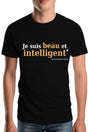 Du second degré et de l'autodérision pour un tee shirt qui vous permettra, qui sait, de rencontrer des jolies filles. Si beau et intelligent" était écrit sans rien d'autre, vous passeriez pas pour quelqu'un de très sympathique surtout que là, c'est écrit en lettres dorées. Ça accentuerait grandement le mauvais effet. Alors que là, avec le petit "après quelques bières" vous rendra beaucoup plus amusant et donnera de vous une image plus amusante et drôle. "